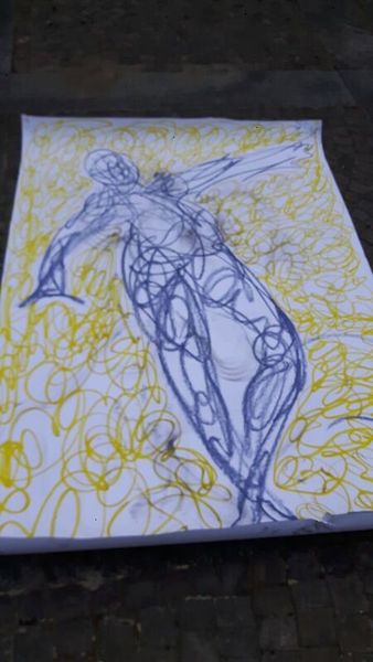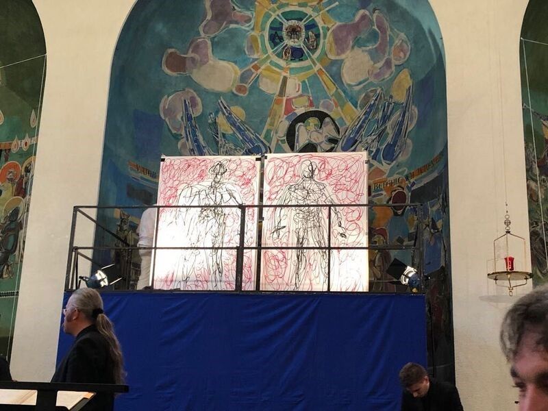 Der Oratorienchor St. Gallen mit dem Orchester La Banda und einem Kinderchor unter der Leitung von Uwe Münch. Auf dem Gerüst malte Antonio Zecca Bilder zu den Schöpfungstexten während der Aufführung.