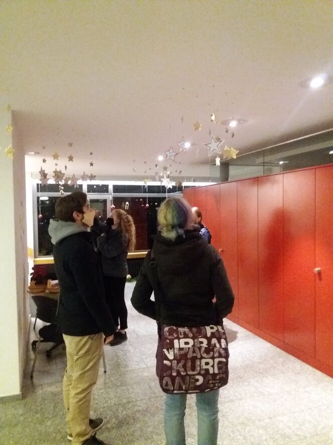Die Besucher geniesen im Advent den Sternenhimmel voller guter Wünsche im Pfarreiheim Heiligkreuz.