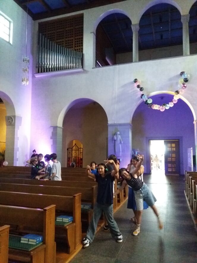 Rund 50 Jugendliche trafen sich in der Dreifaltigkeitskirche Heiligkreuz um den Start der Sommerferien zu feiern. Bei der Silent Disco erhält jede Person einen Kopfhörer auf dem sie direkt zwischen drei Playlists auswählen kann. An den farbigen Lichtern an den Kopfhörern ist zu sehen wer auf welcher Playlist ist, so sieht man wer zum gleichen Lied tanzt wie man selbst.