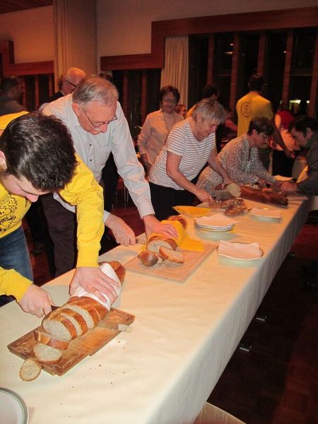 Brotschneiden im Akkord und Takt für 120 Personen.
