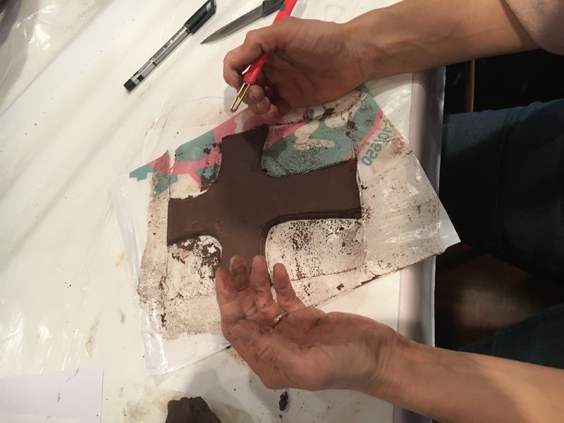 Die Eltern modulieren aus Ton das Erstkommunionkreuz.