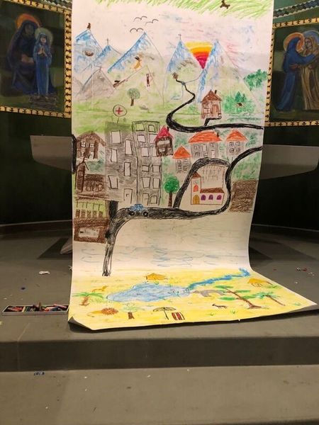 Der Oratorienchor St. Gallen mit dem Orchester La Banda und einem Kinderchor unter der Leitung von Uwe Münch. Auf dem Gerüst malte Antonio Zecca Bilder zu den Schöpfungstexten während der Aufführung.
