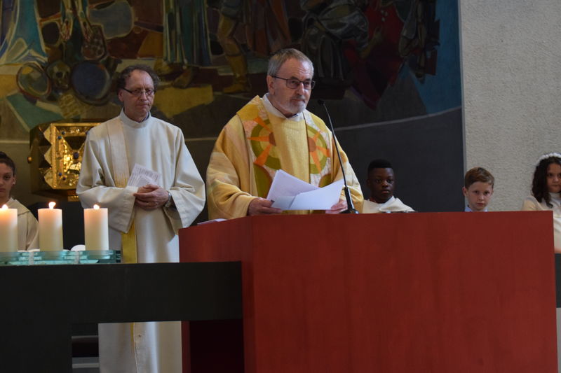 Am 3. Juni feierten 24 Kinder ihre Erstkommunion im Heiligkreuz. Die Eltern haben für ihr Kind ein Kreuz modelliert, das an diesem Tag gesegnet und den Kindern übergeben wurde. Die Kirche war mit 600 Personen bis fast auf den letzten Platz gefüllt.
