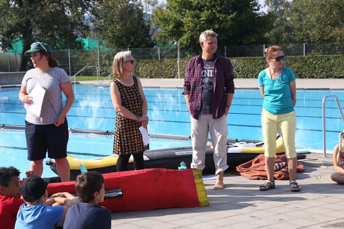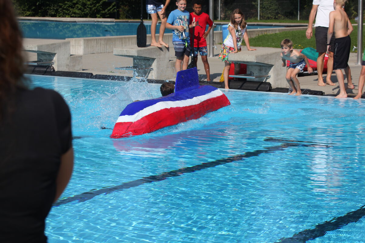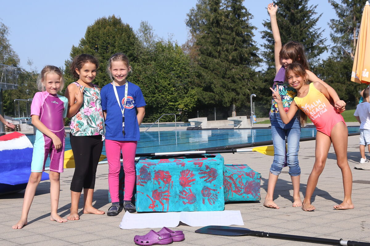 3 riesige Papierboote starteten danach unter dem Beifall der Zuschauer durch das grosse Schwimmbecken. 16 Kinder und ihre Familien hatten seit den Sommerferien mit viel Einsatz an den Booten gebaut.