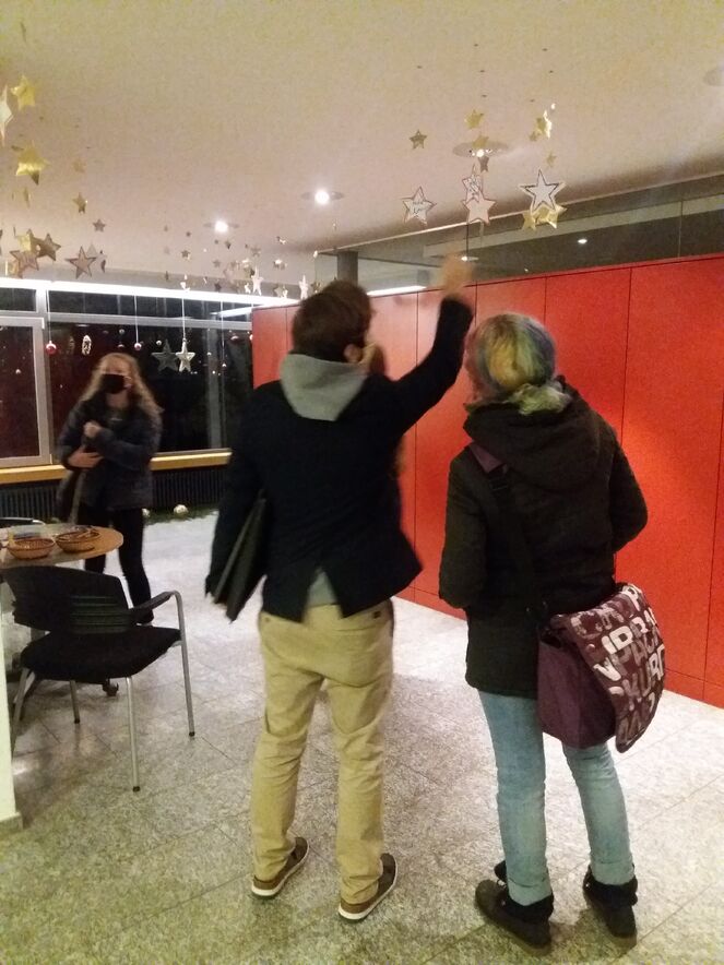 Die Besucher geniesen im Advent den Sternenhimmel voller guter Wünsche im Pfarreiheim Heiligkreuz.