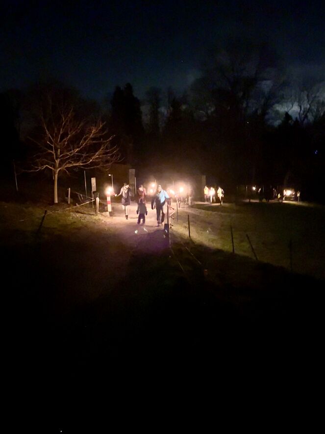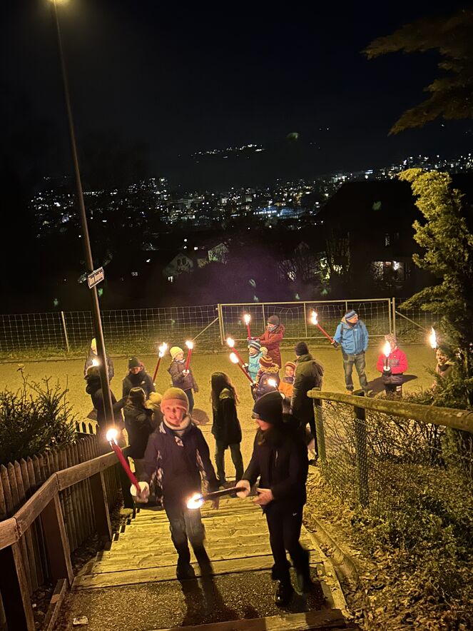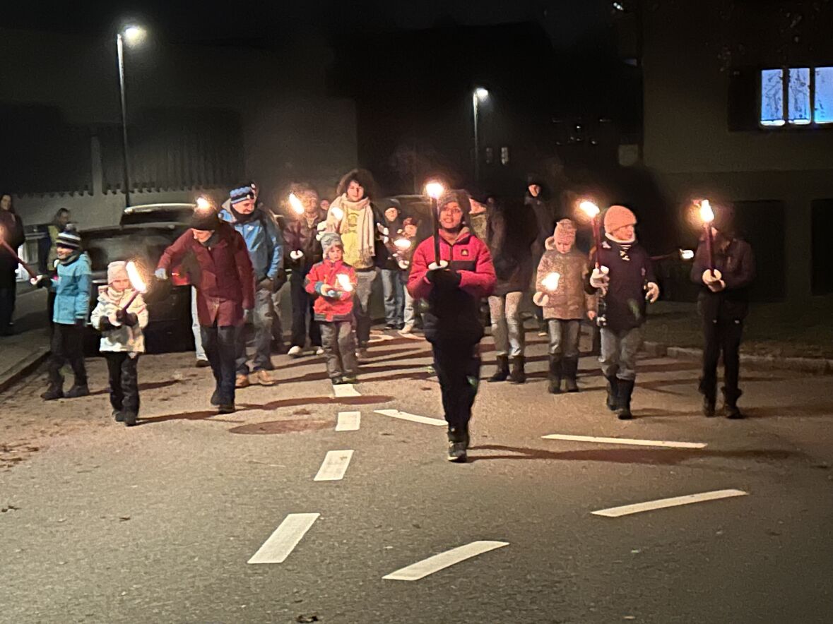 Mit einem Fakelumzug machten gross und klein sich auf den Weg zum Wald bei Peter und Paul. Bei trockenem Wetter und fröhlicher Simmung feierten alle im Schein des Feuers und mit besinnlichen Liedern Waldweihnachten.