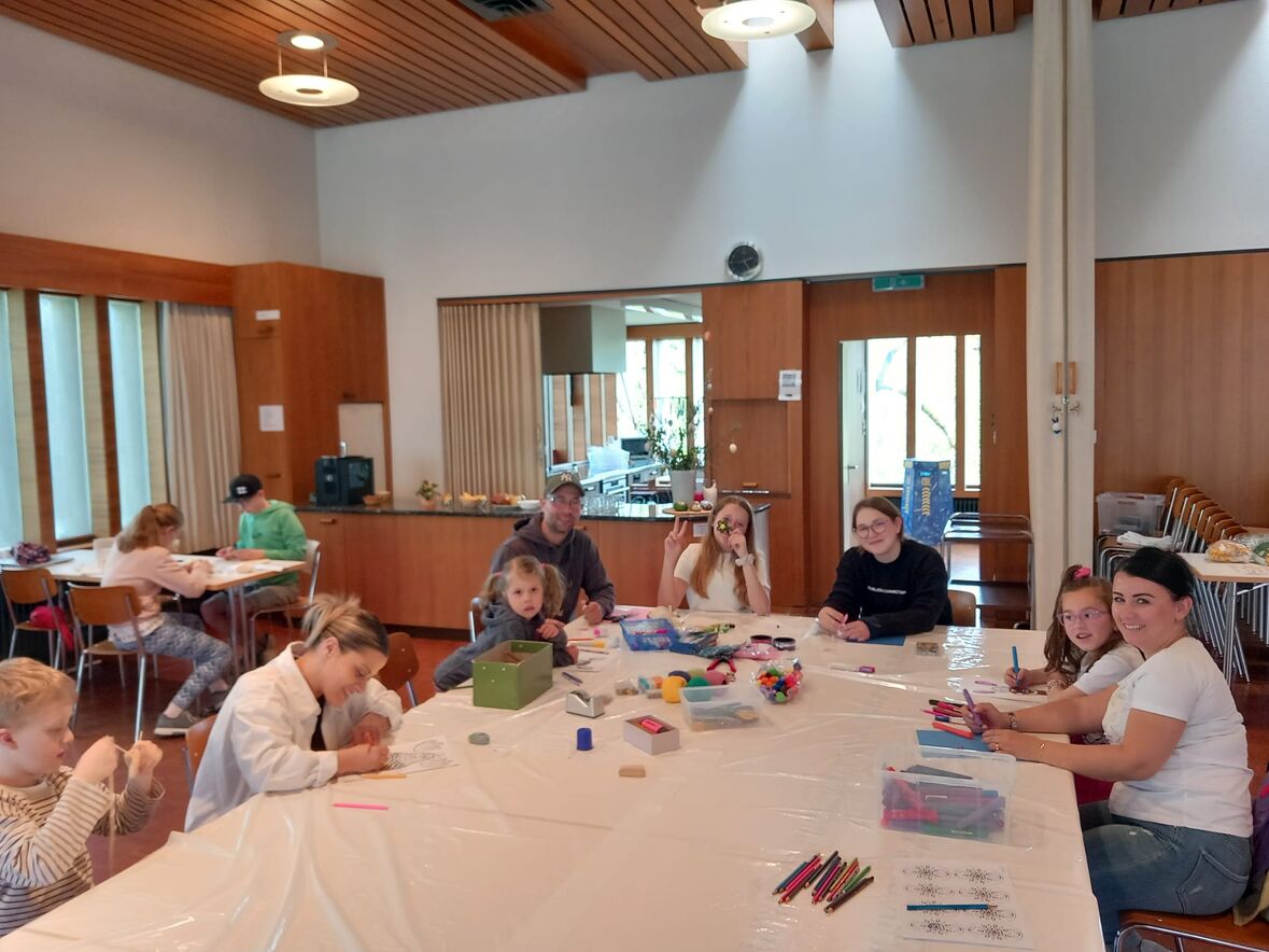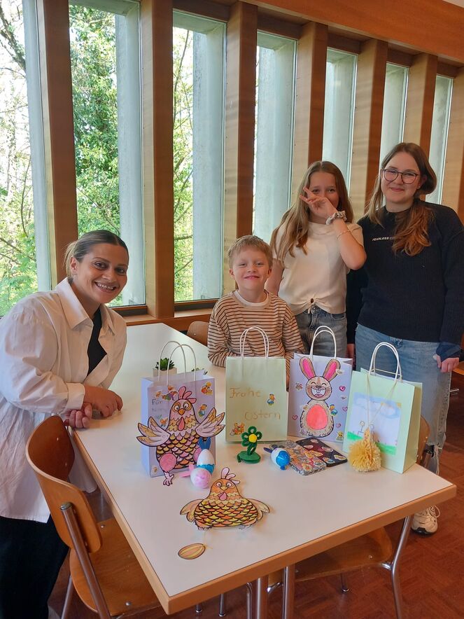 Eifrig haben Kinder und Erwachsene Ostereier bemalt und Ostertaschen gestaltet. Beim knüpfen der Schnüre für die hampelden Hasen und bunten Hühner war Fingerspitzengefühl gefordert. Am Schluss des Nachmittags haben viele lachende Kinder und Jugendliche ihre Ostergeschenke nach Hause gebracht.