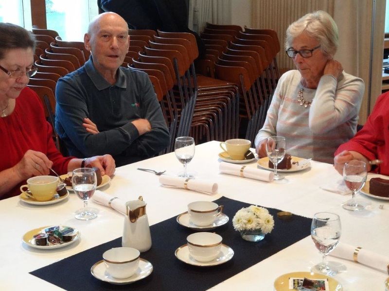Auf jedem Tisch standen Kaffee Tassen aus Porzellan.