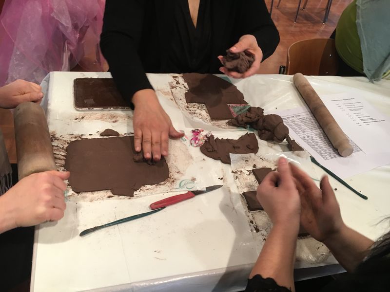Die Eltern modulieren aus Ton das Erstkommunionkreuz.